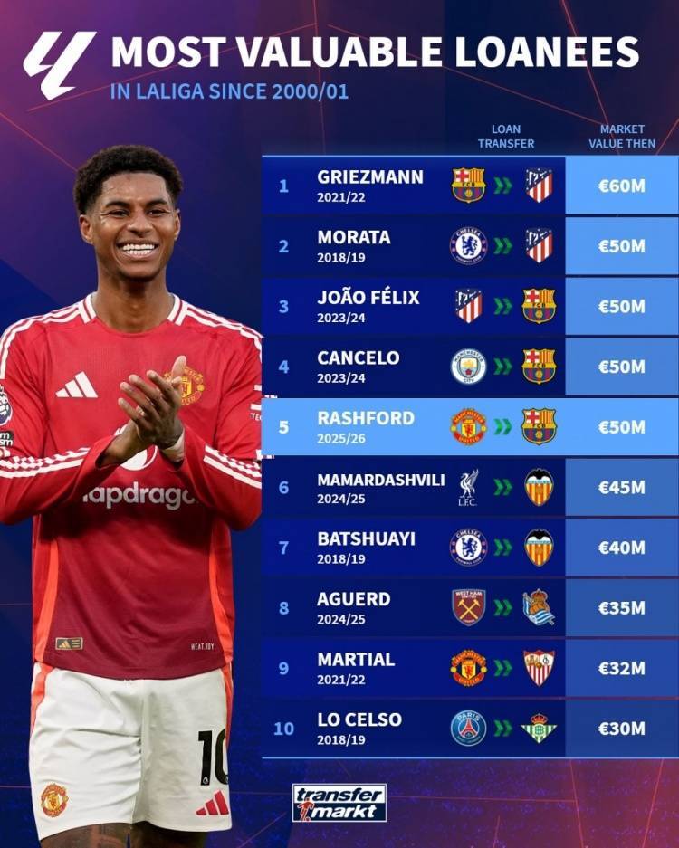 直播吧7月24日讯 德国转会市场统计了本世纪以来租借加盟西甲俱乐部球员的身价,并列出榜单,格列兹曼6000万欧居首,拉什福德5000万欧排名并列第2位。